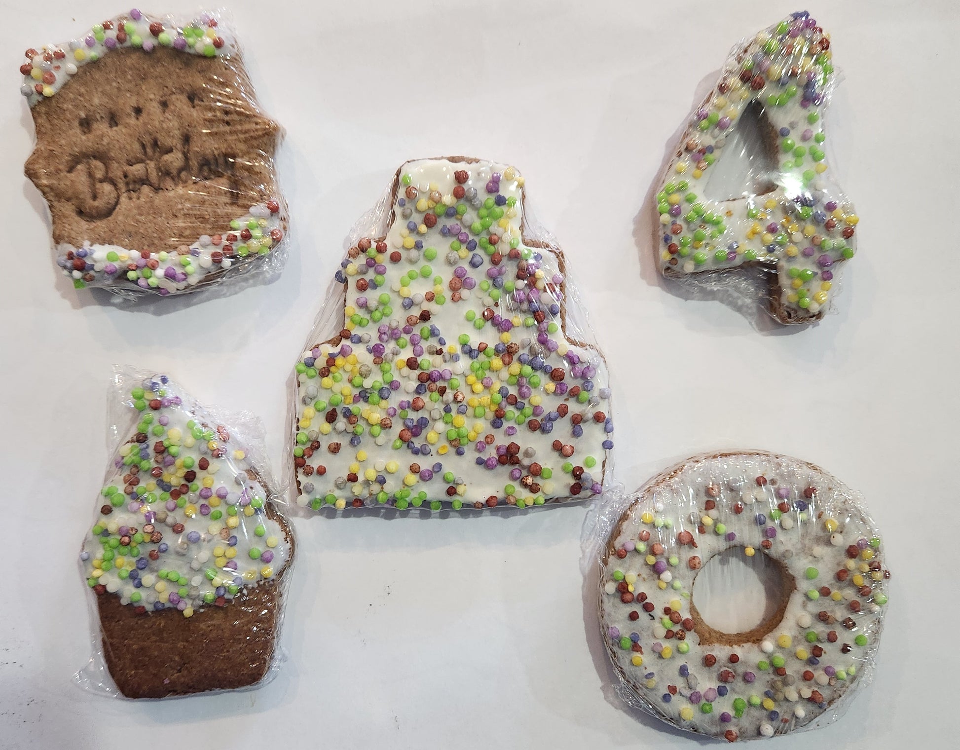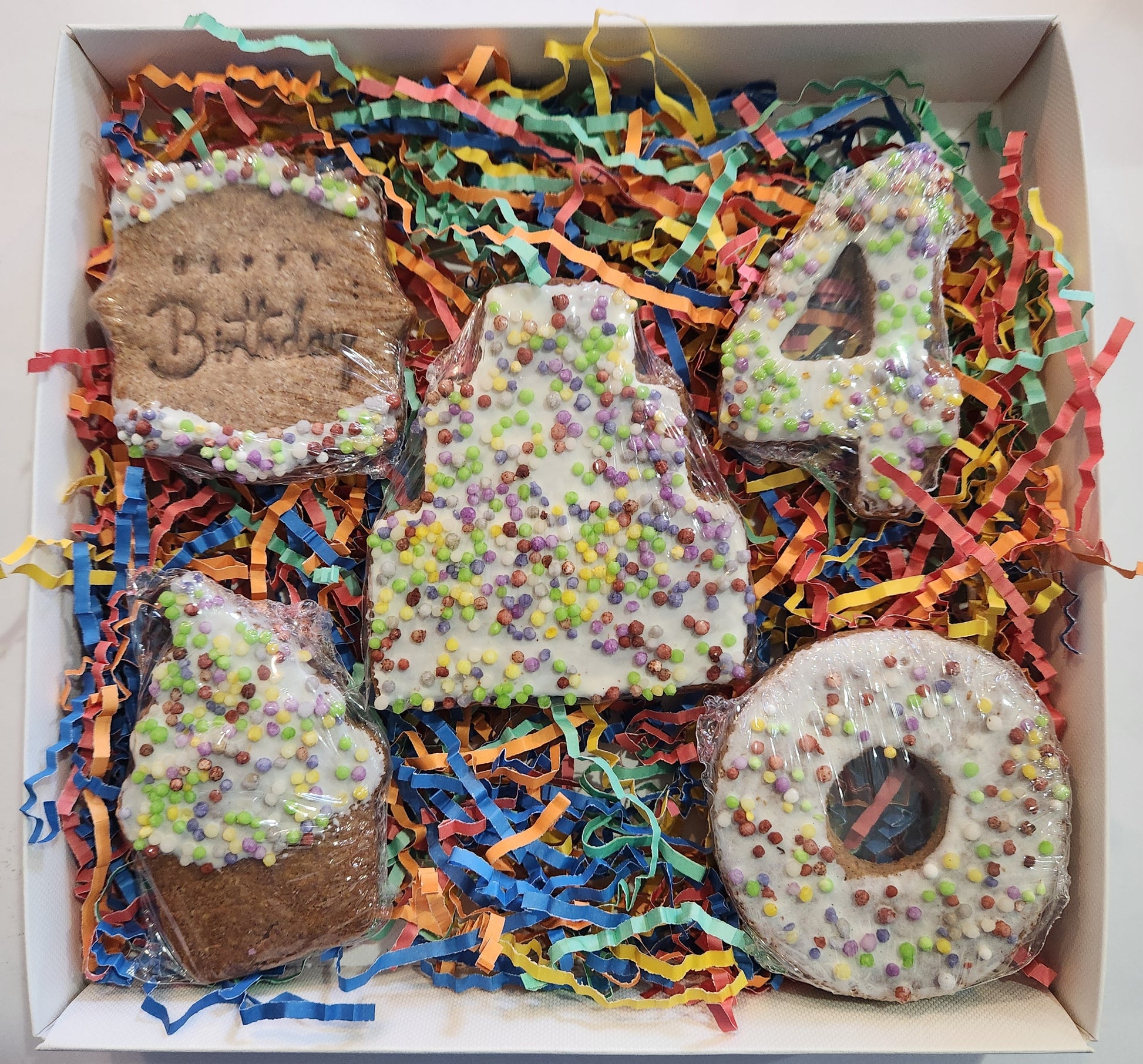 Celebrate your pup's special day with our Birthday Box! This delightful box includes 5 delicious cookies and a special number cookie to mark their age. Give your furry friend the gift of a tasty birthday celebration!