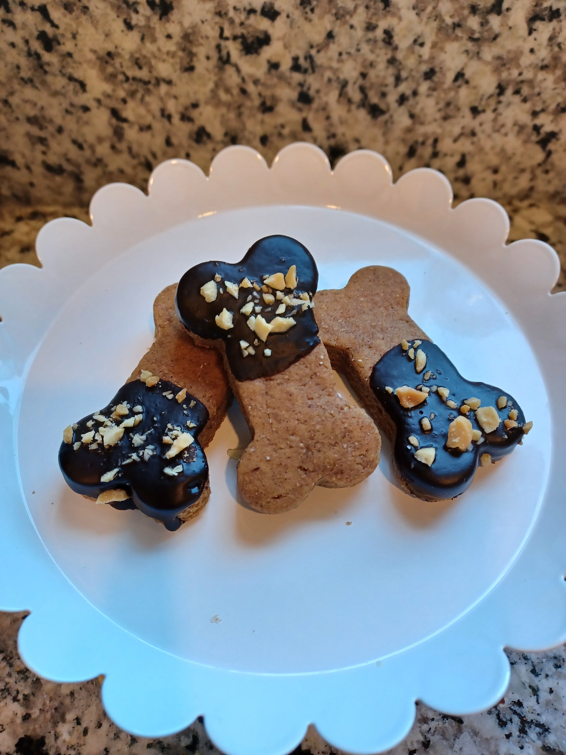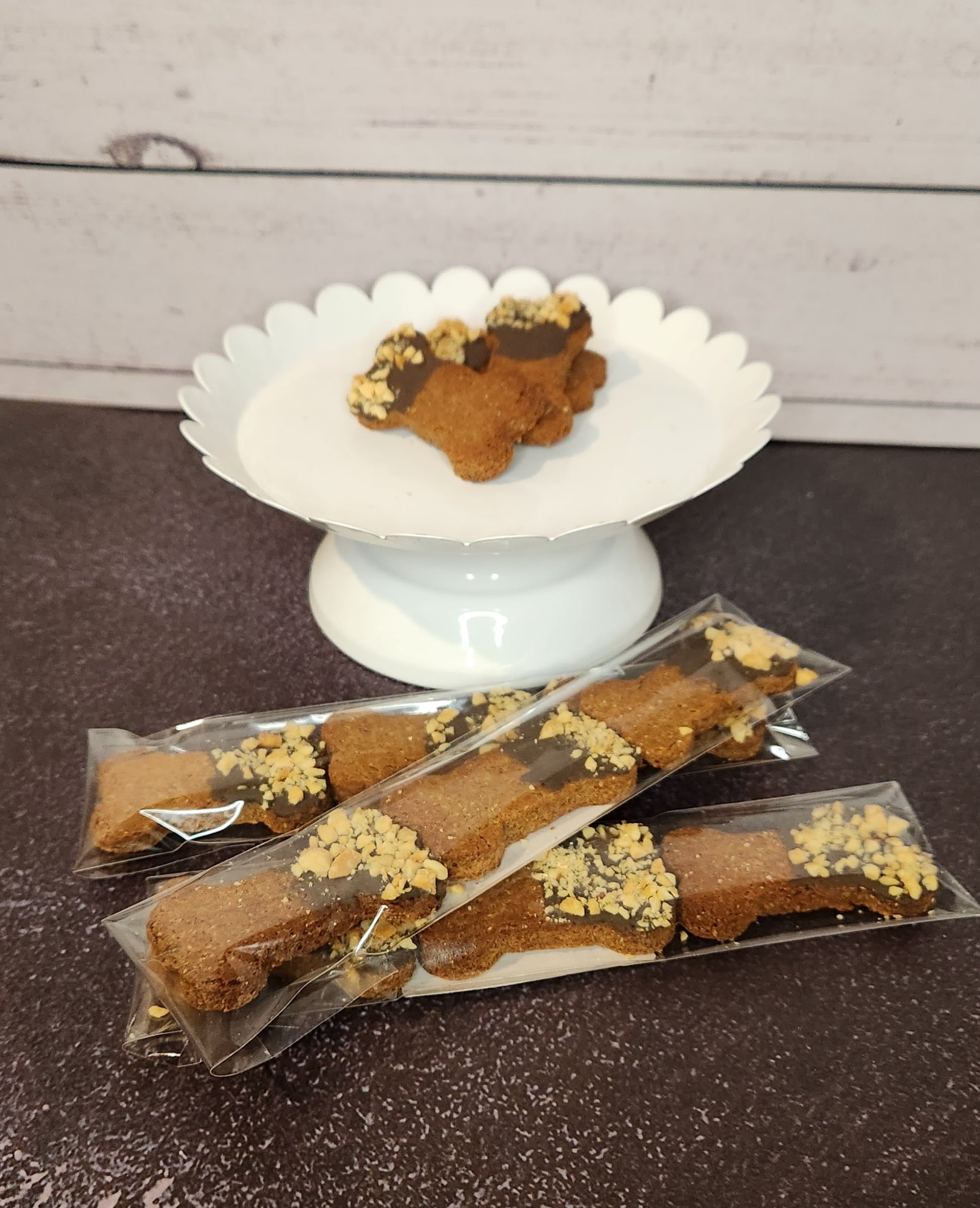 These smaller cookies are adorable peanut butter dog bones are dipped in carob (chocolate for dogs) and then sprinkled with unsalted peanuts. These cookies are approximately 2.5 inches long and are handmade in small batches with all natural, preservative-free ingredients. Your fur baby will love these.
