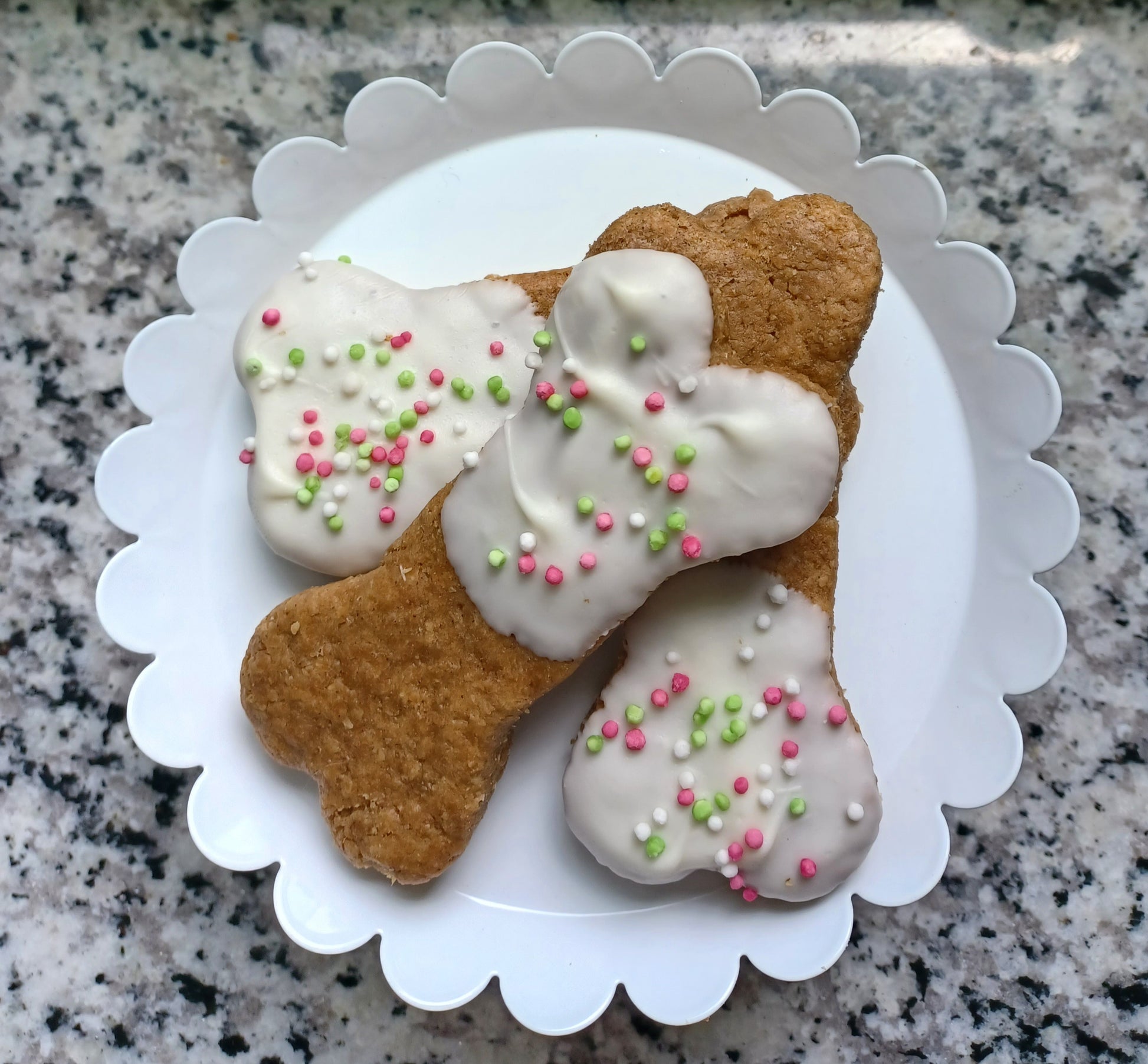 These adorable peanut butter dog bones are handmade in small batches with all natural, preservative free ingredients. They are 4 inches long. Your fur baby will love these. They are dipped in yogurt icing and topped with tapioca pearls. (colors may vary)