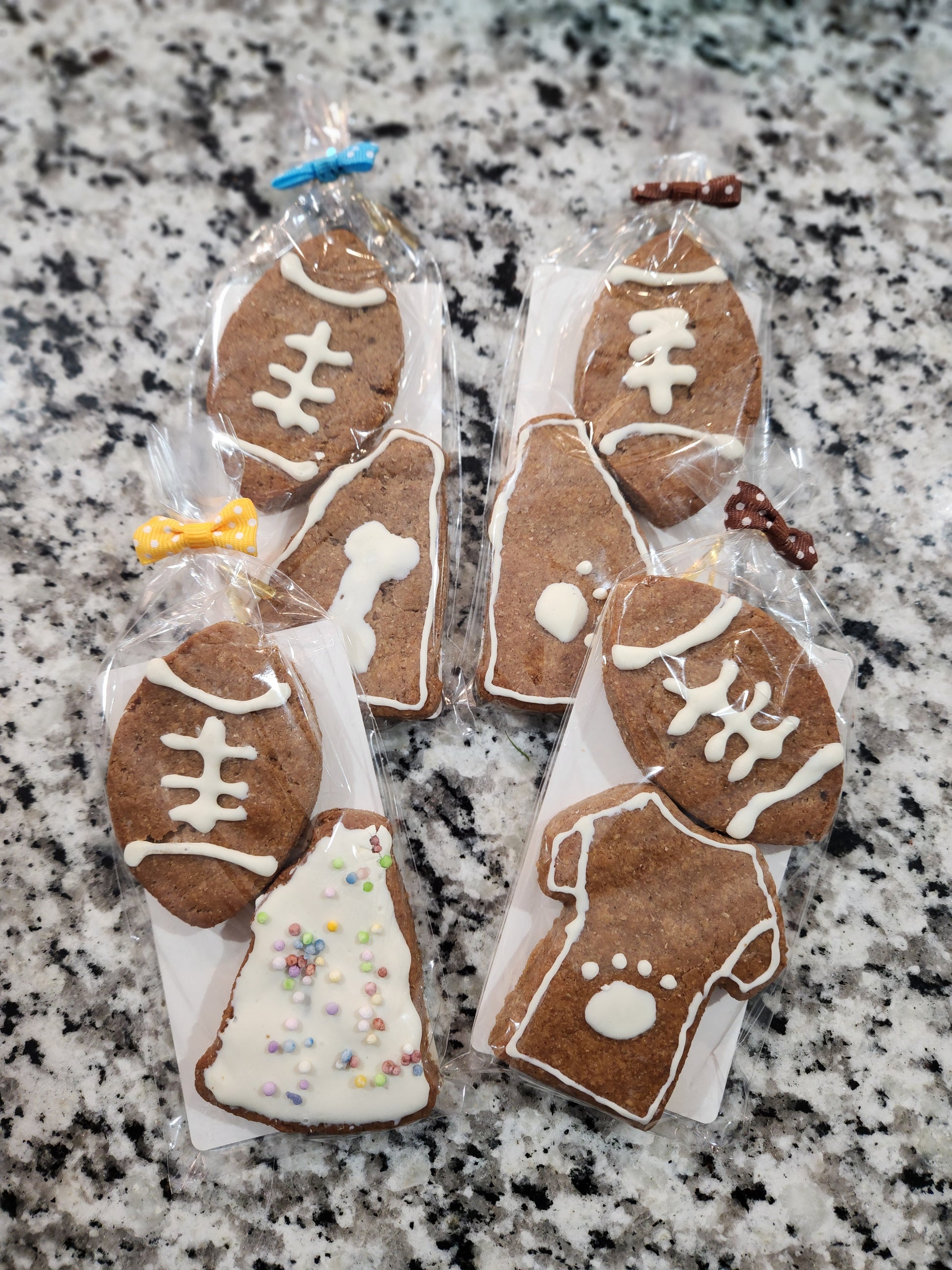Score a touchdown with your furry best friend with our delicious football cookies! Made with all-natural ingredients, these dog treats are perfect for tailgating or any game day celebration. Choose from a fun megaphone or jersey design. Go team!